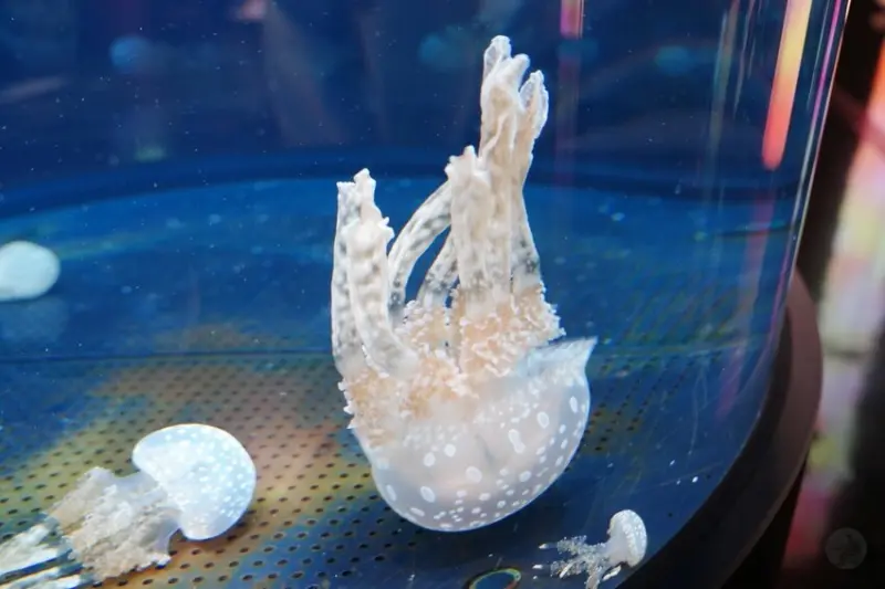 另外,水母 Yonna 區超酷的,這裡的水母會一直變換顏色,彷彿進入了一個燈光和聲音的奇幻世界!光是看著它們隨著光線變化就覺得好療癒,真的很夢幻~