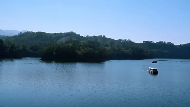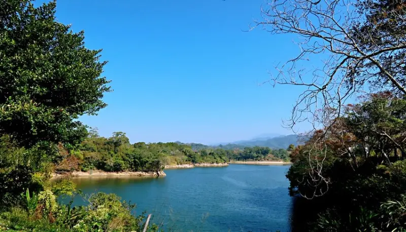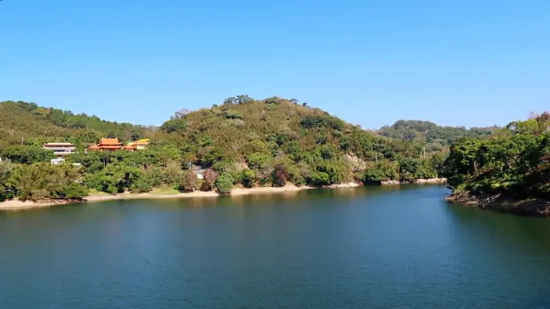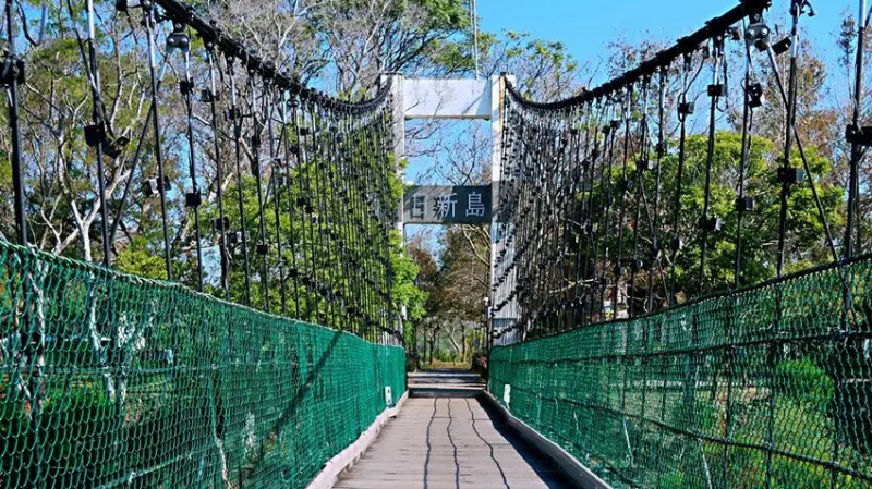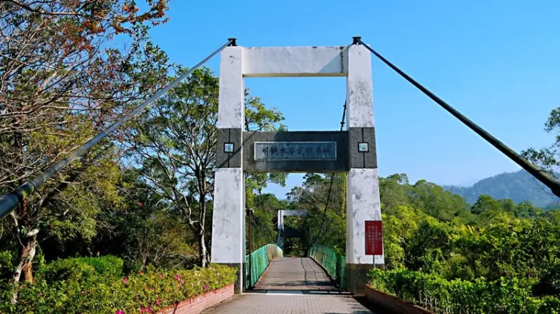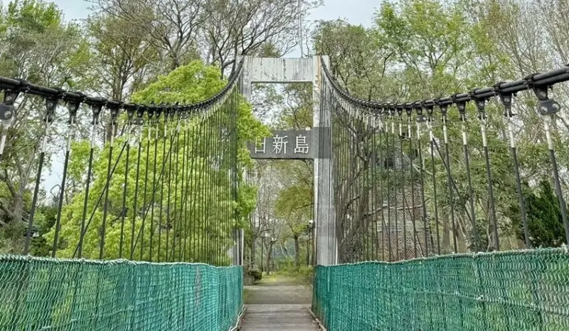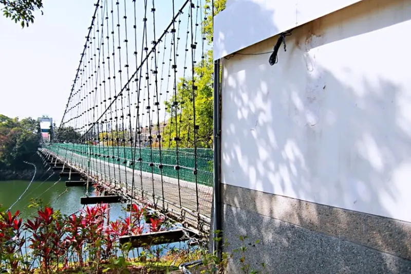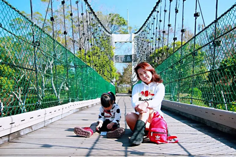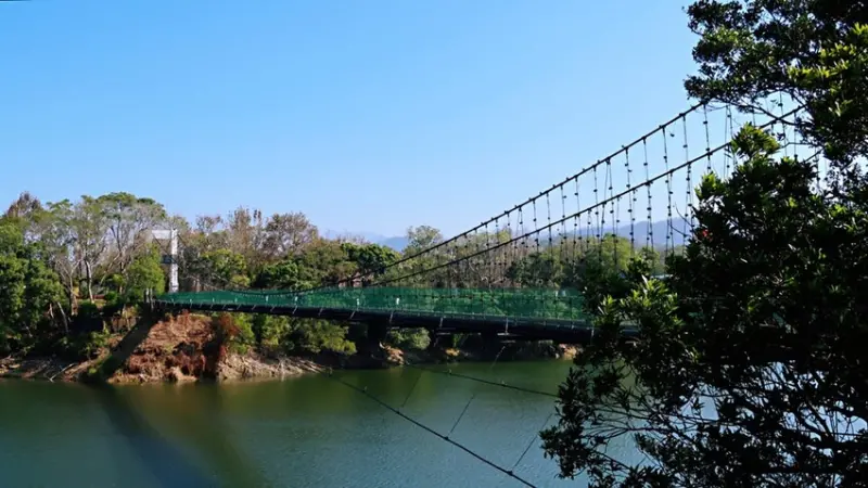風光明媚的明德水庫,水庫內共有日新島、鴛鴦島、海棠島三個島,各有各的特色,但又以日新島最為特別,需要靠一號吊橋或是二號吊橋才可進入的湖中之島。