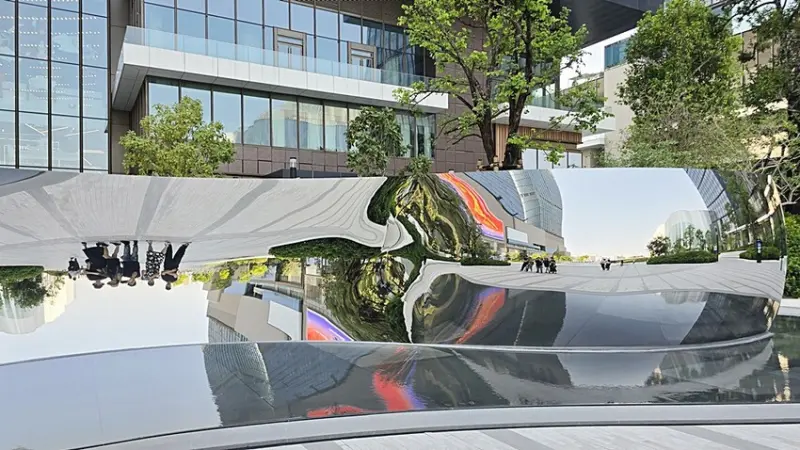 廣場裡還有一面哈哈鏡,反射出來是顛倒的鏡像,很有趣喔!