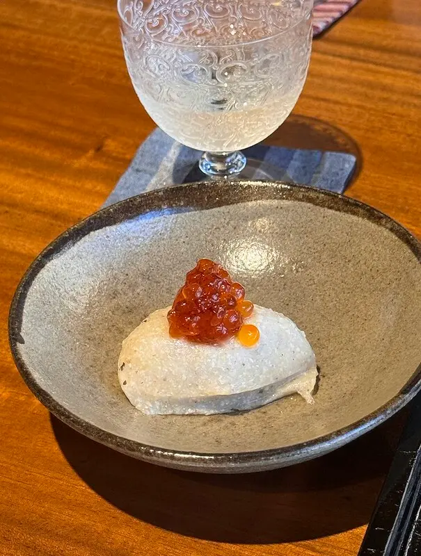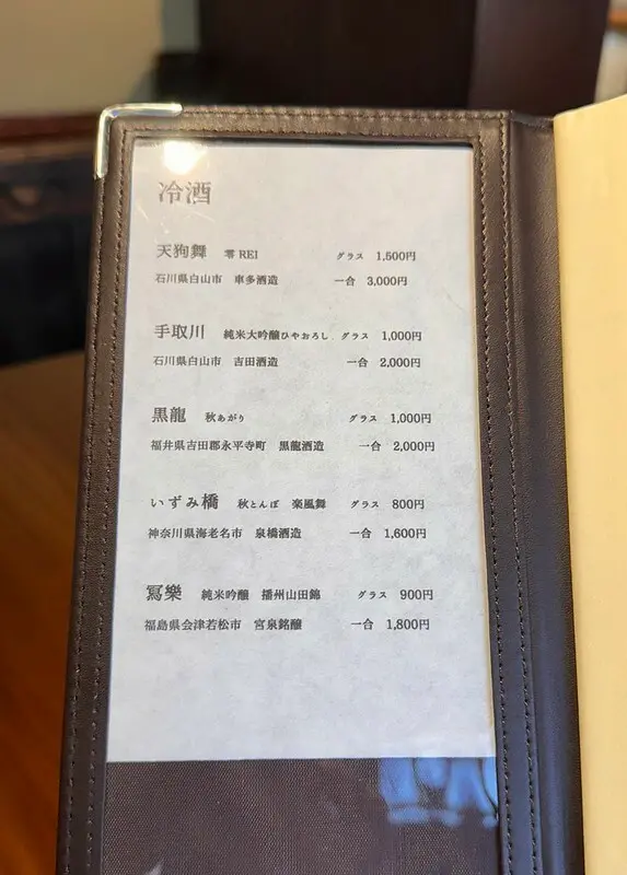 以米其林餐廳來說,這裡的酒算是相對平實,尤其是台灣很貴的黑龍,在這一杯也只要1000日幣,當天我們點的是石川白山吉田酒造的手取川。個人覺得北陸的酒都帶有一點像是新潟的淡麗,再加上北陸清酒柔合的酸度和旨甜,對於初入門的清酒愛好者,應該是蠻好的選擇。