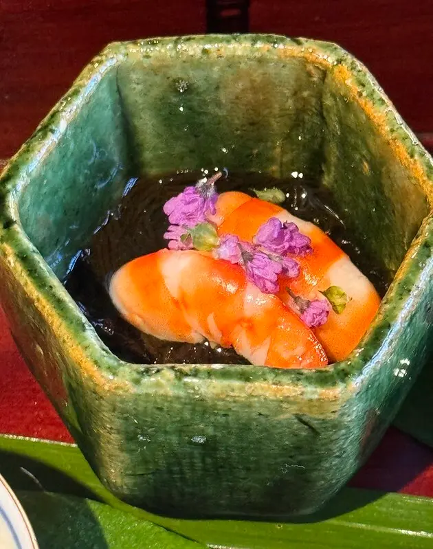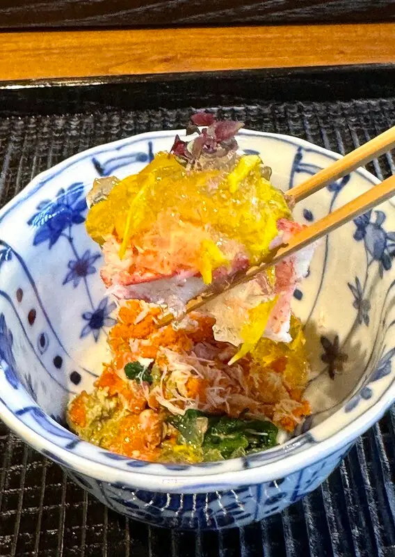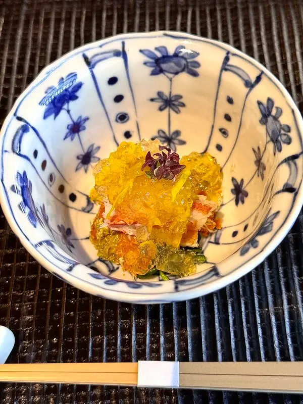 第一道是蟹肉、菊花凍,別看它有一小碗,它是整隻整隻帶蟹黃的紅楚蟹的量,搭配帶點醋酸的菊花凍帶出蟹膏的前濃和蟹肉的後甜,吃完那鮮、那酸卻在唇舌間久久不散。另外,碗裡也放著不少金澤的野菜,說法是以金澤一帶的鄉土料理為概念融入。