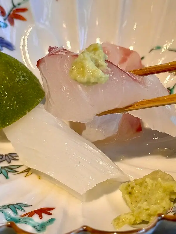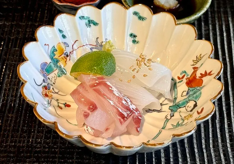 花枝/鯛都是北陸產的,花枝雖然薄切但脆、Q、軟、綿一個層次也不少,上面用芝麻點味倒是相當少見,另外鯛感覺是野生磯約的那 種,口感脆Q有咬勁,魚甜單純綿長,滴點像是金桔的酸和芥末比醬油更能引出魚鮮。