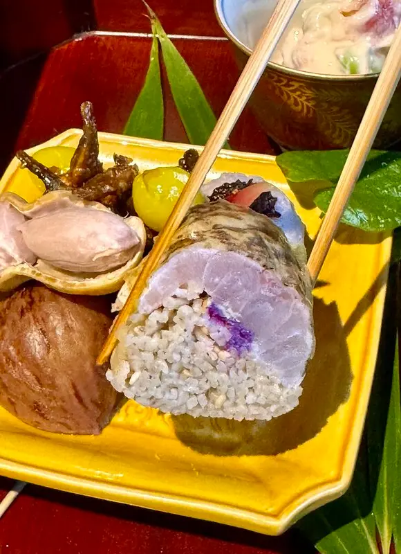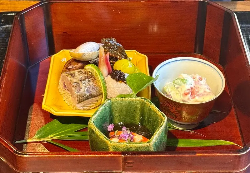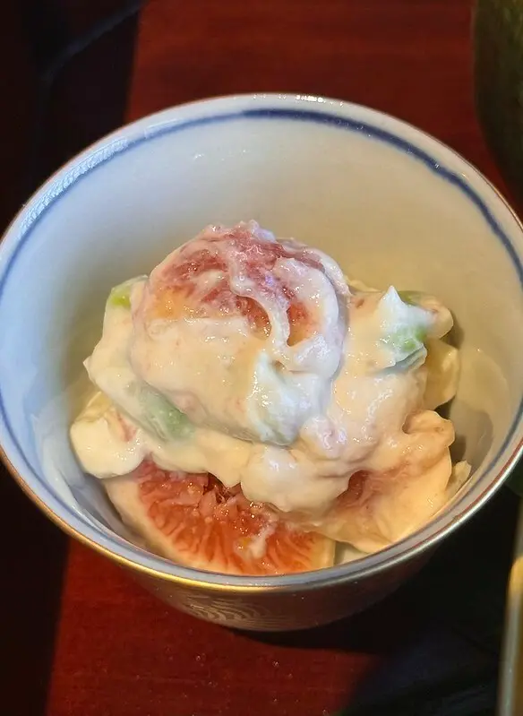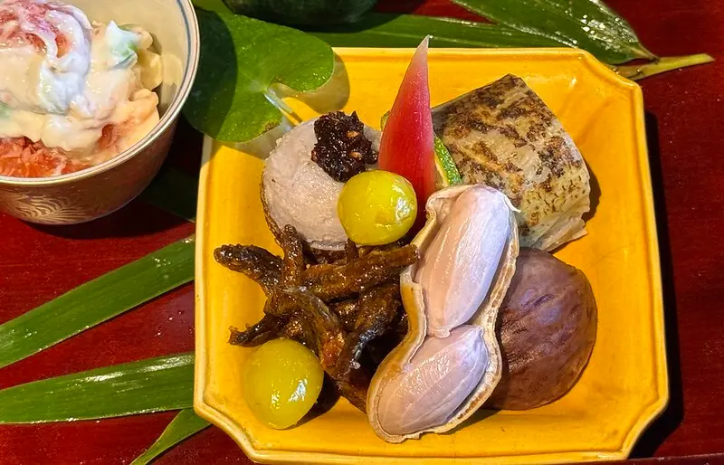 魚乾/醋漬梭子魚/蕎麥/里芋/栗子,蝦/水雲醋,白芝麻/白酢/豆腐:無花果/蜿豆