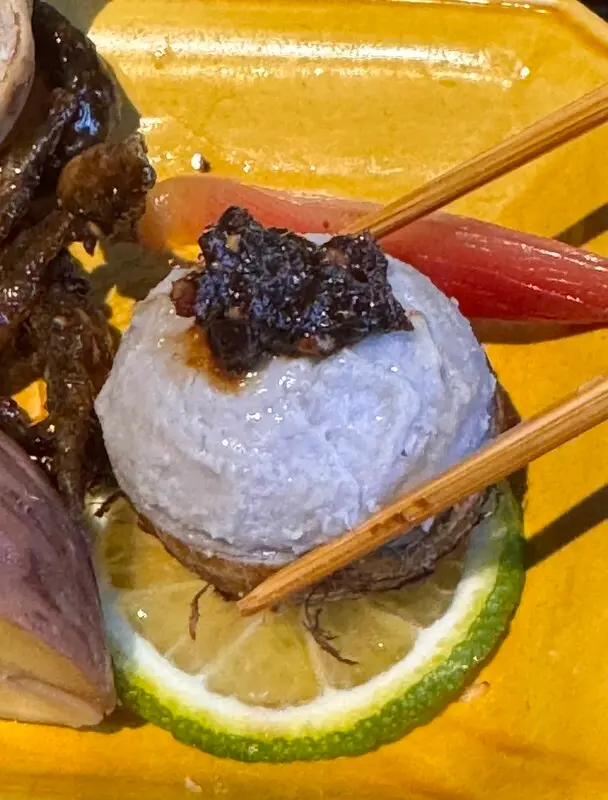 這剝了皮的里芋超級綿也超級甜,就像磨成泥的山藥一樣,混著底下的檸檬片一起吃,別有一番酸甜新滋味。
