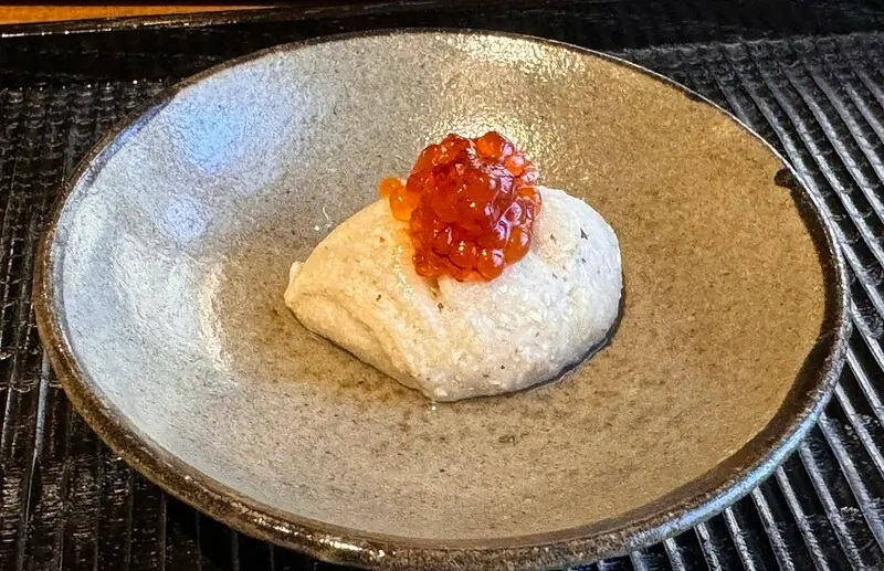 第二道蕎麥かき,這道蠻有意思的,外表像是用蕎麥的懷石饅頭,裡面居然包了北陸的牡蠣,因為一開始沒注意聽,直接一口就吃...沒拍到斷面秀,但記得當時我的反應應該是OMG,居然兩者可以組合成這般美味,猜想應該是我目前為止吃過最驚喜的牡蠣料理了。創意據說是來自加了牡蠣的蕎麥,但通常是分開加在上面,或是牡蠣天婦羅蕎麥。主廚在這也跟客人玩了一次食材的捉迷藏。