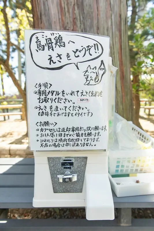 最後是3+1的特色.神社有雞圈養的是烏骨雞,但純白的羽毛很漂亮,本來以為「要」錢的飼料扭蛋,後來才發現無料….,裡面是玄米(吃真好)。
