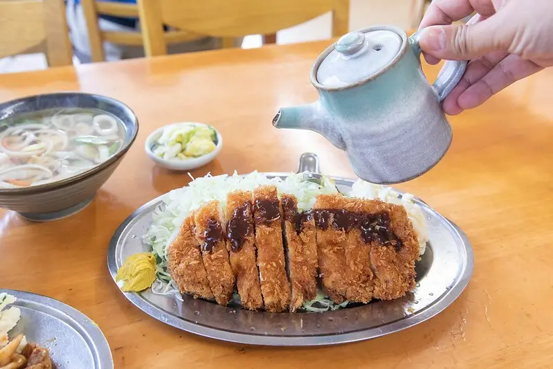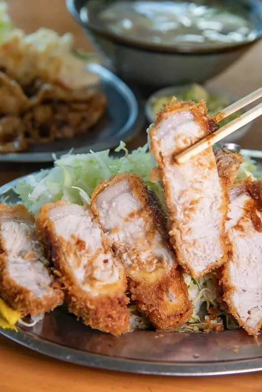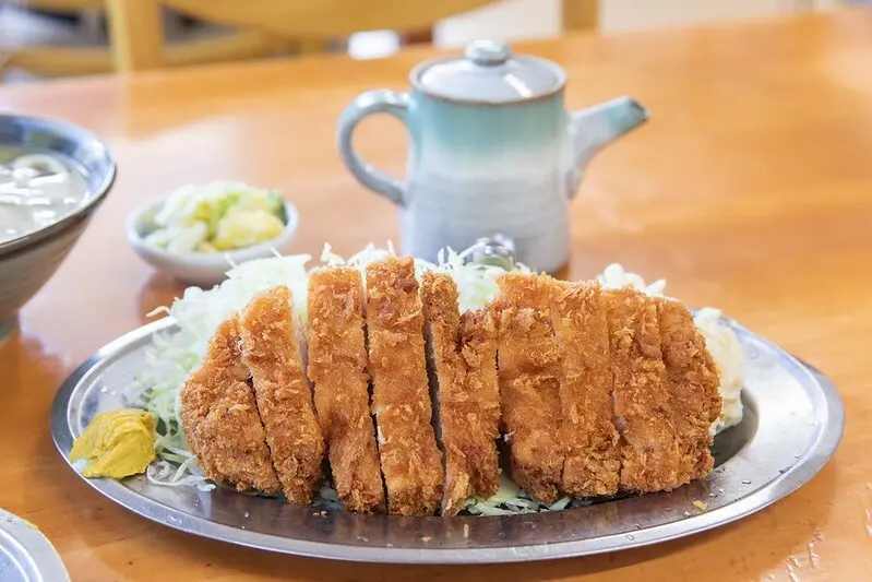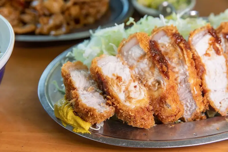 炸豬排大而且厚切,肥瘦的比例大約是2:8,,吃在嘴裡飽嘴、軟嫩、又同時有油化,外衣也炸的算是酥脆,但略為油了一些,除了豬排醬也可以沾附上的黃芥末。