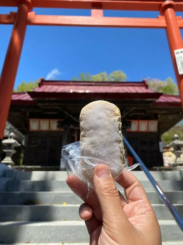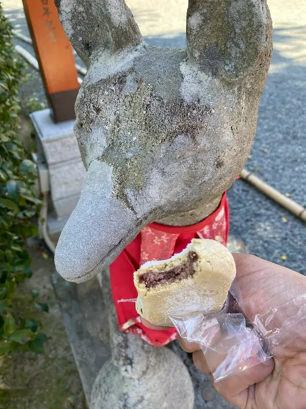 五郎在店門口吃,我本來也想學,但剛好有人坐著,於是帶到高屋敷稻荷神社吃。外層有一點像最中,口感偏酥,中間的餡是紅豆,但外層好像還有舖一層黃豆粉,咬時掉得滿地,幸好是在戶外,紅豆偏乾而且蠻甜的,要配茶不然真的又乾又甜XD。不過,整體來說算是特別,最少我在其他地方沒吃過。後來就郡山友人的說法,以前很多人會買這個,拿來當高屋敷稻荷神社當祭品。