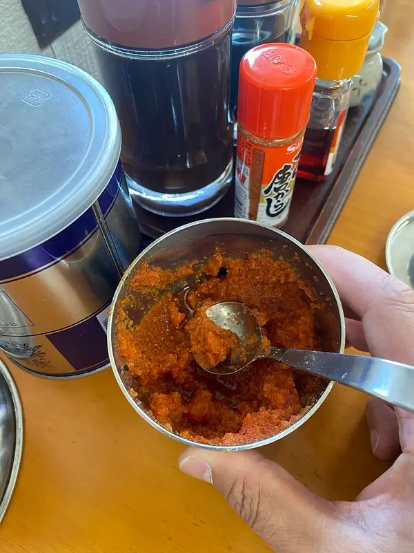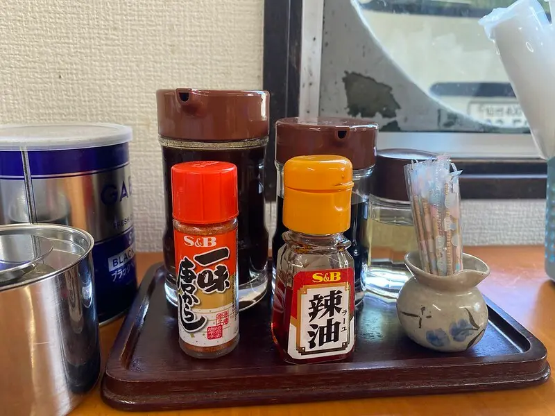 桌上有鹽、醬油、辣椒粉、辣油,還有這個像是自製的辣油,有一點像我們牛肉麵裡加的牛油,吃起來有一點像混了味噌的辣醬,有一點像是燒肉用的醬汁,如果覺得味道不夠可以自行加量。