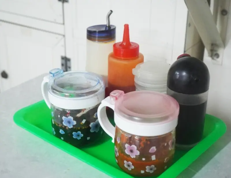 後方則是用餐區,有多張方桌,還有一個調味料區。