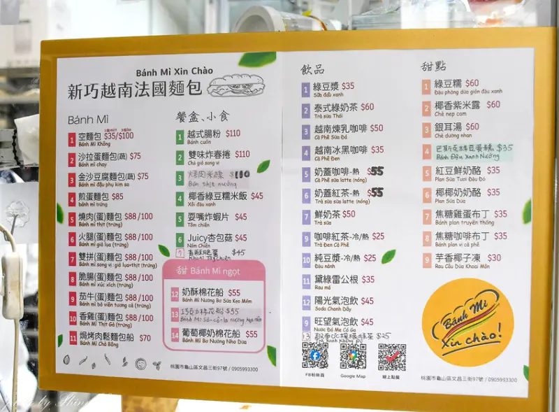 附上翻拍的菜單給大家參考,有各種口味,大小尺吋價都不同,法國麵包從35元-100元都有,另外還有腸粉、春捲等越式小吃