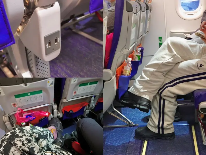 位置真的大上許多且還可以翹二郎腿耶!位置斜前方還有usb充電孔座『行動電源需隨身攜帶,不得托運與放置置物櫃,飛行過程禁止使用行動電源』另外乘坐逃生出口位置的旅客,包包不能放在地上,都必須放在上方置物櫃。