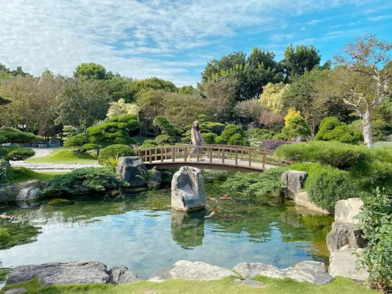 充滿日式庭園之美的和園,外圍又繞上一圈翠綠的草坪與綠樹,彷如進入一處森林內,並適時點綴粉紅紫薇花,湖中野鴨悠遊戲水,與藍天白雲相襯,美不勝收。和園上池情人橋也是成美文化園TOP1的拍照打卡熱點。