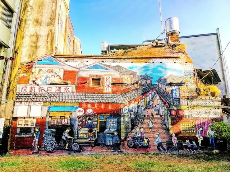 參觀了成美文化園之後,永靖鄉也有一條老街,永靖老街曾是台灣第一條私人建街,最有名的景點是畫家所繪的永靖故事牆,這似曾相識的街景牆,與成美文化園區的樂展間所展永靖老街圖相似,但此圖的實景地也值得一訪。
