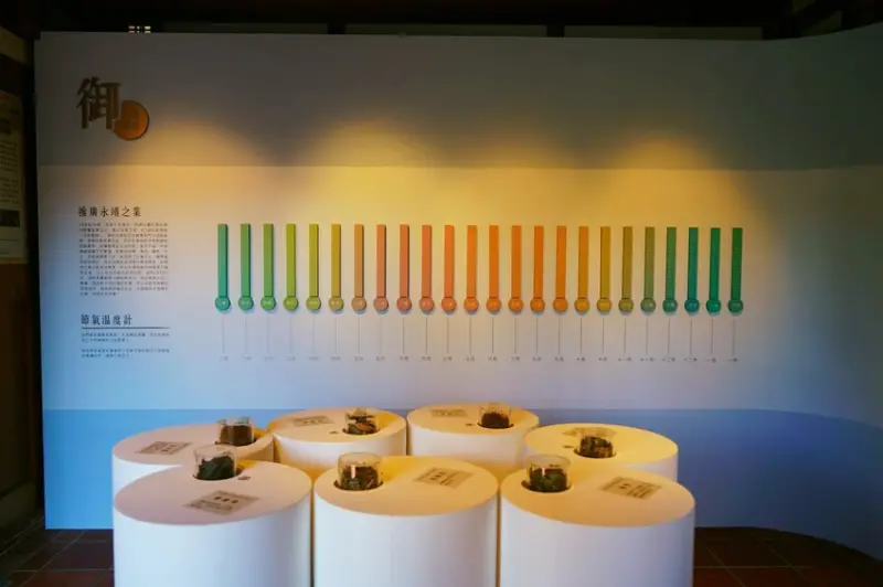 「射」間展示傳統剪黏泥塑裝飾,「御」篇主要展示二十四節氣溫度計,只要抽出溫度計就能得到食療秘方,白色柱狀展台上的「中草藥」設計了許多小孔,不僅能看到中草藥本體,還能聞到它的淡雅香氣。「書篇」,主要呈現一些特別的合體字,像我們常見的”招財進寶”和”黃金萬兩”等,在這個地方也有一個大黑板讓小朋友拼字。