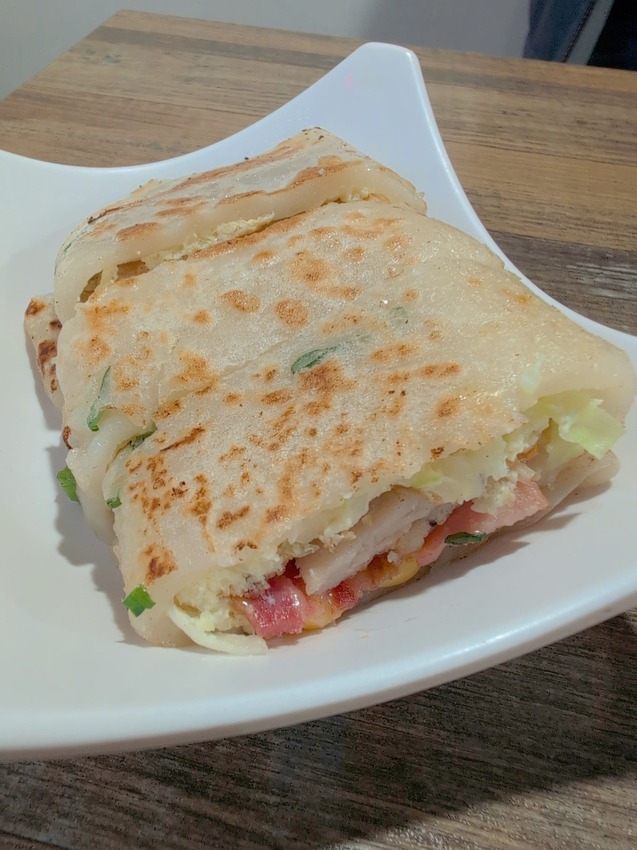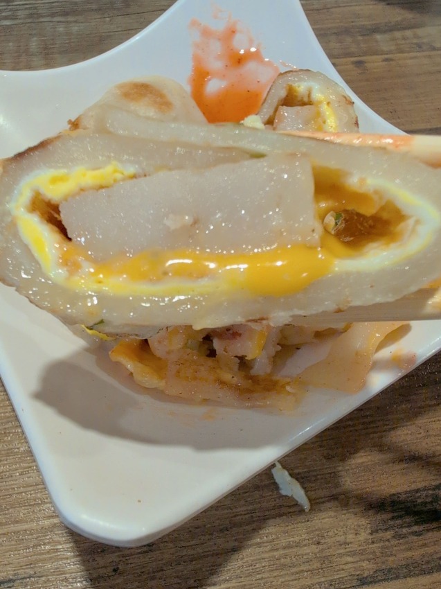 這個相較招牌,在整體的口味上就比較普通了,因為蘿蔔糕包在蛋餅裡就吃不太到本身的味道,再加上起士的濃厚