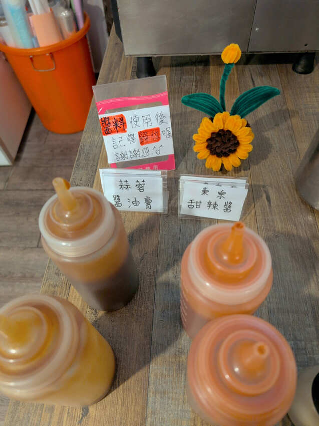 醬料區,有東泉甜辣醬跟蒜蓉醬油膏可依個人口味自行添加