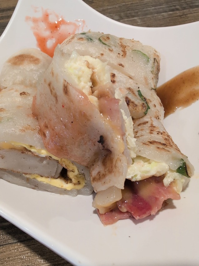 招牌裏頭有火腿、高麗菜絲、培根等,粉漿蛋餅皮是偏Q軟的口感,搭配滿滿內餡,份量十足啊!!!!!
