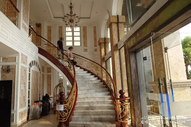 飯店大廳的裝潢看起來有些年代感,頭頂上的燈飾、前方的旋轉樓梯、古典風的桌椅看起來還有點氣派呢!