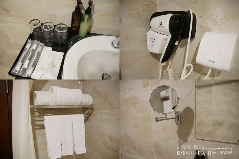 有快煮壺、礦泉水、沖泡咖啡茶包、冰箱、保險箱、盥洗用具、毛巾、浴巾、吹風機,該有的都有了