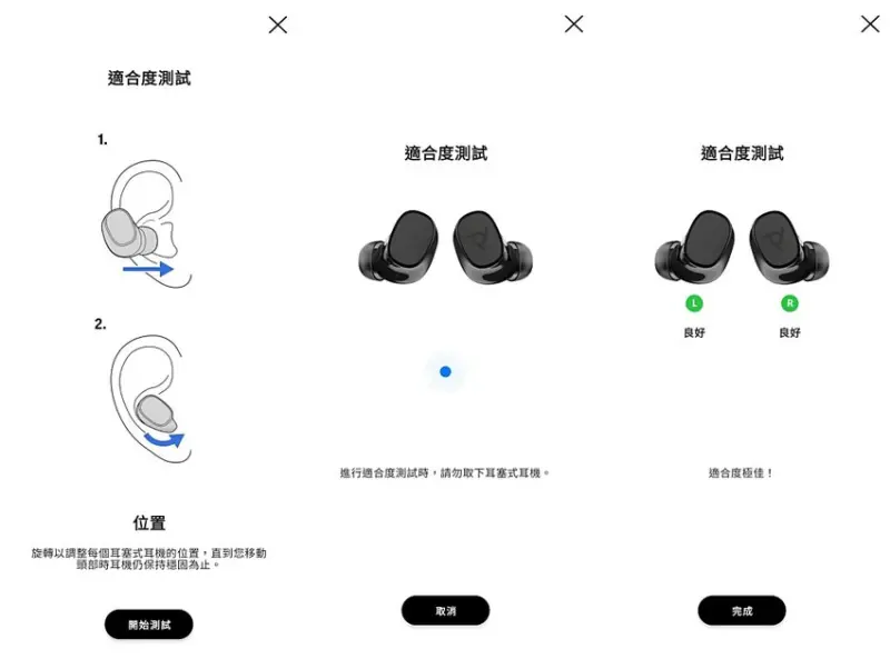 - 步驟3:若貼合度不佳,可嘗試更換 XS、S、M、L 耳塞,直到系統顯示「貼合度良好」。