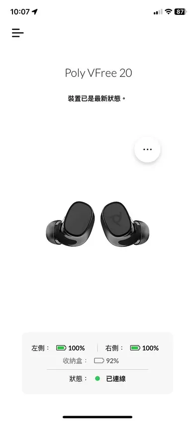 在 Poly Lens APP裡面,也可以清楚看到左右耳、收納盒的電量,以及目前連線狀態。