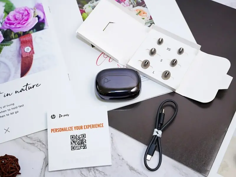 耳機提供XS、S、M、L 四種尺寸的矽膠耳塞(可透過 POLY LENS APP 進行 AI 智能貼合度測試,確保耳塞緊密貼合耳朵,提高降噪效果)