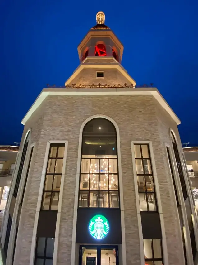 星巴克台中麗寶門市:擁有歐洲鐘樓的外觀,內部挑高的大廳讓人彷彿置身於歐洲。