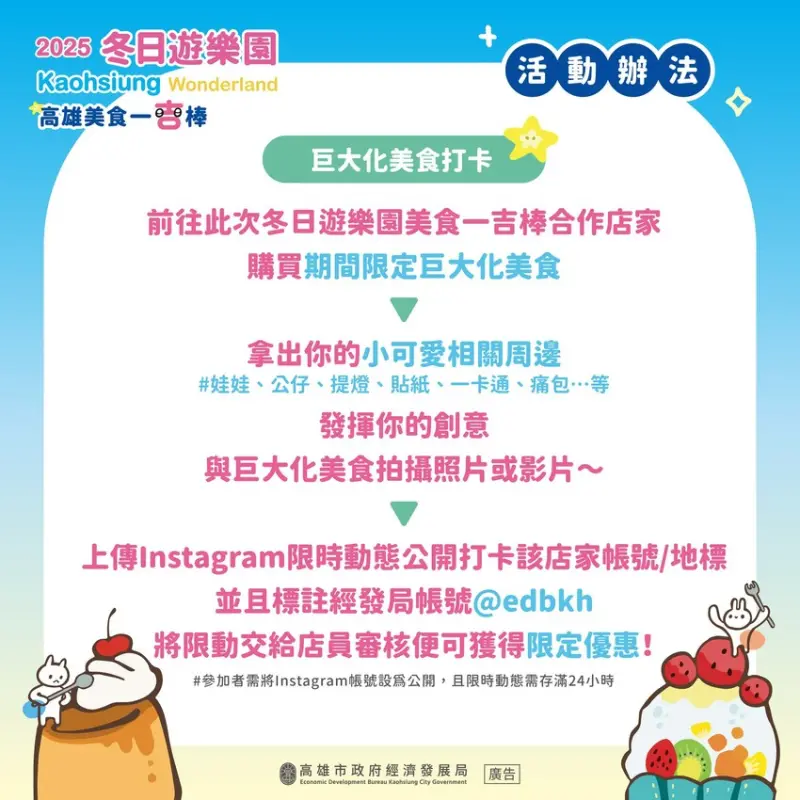 冬日遊樂園還有跟高雄美食一吉棒合作,只要購買期間限定的巨大化美食,再拿出可愛的相關產品:娃娃、公仔、提燈、貼紙或一卡通等,跟巨大化美食公開拍照打卡,上傳IG限動,並標註經發局帳號@edbkh,即可獲得限定優惠喔!