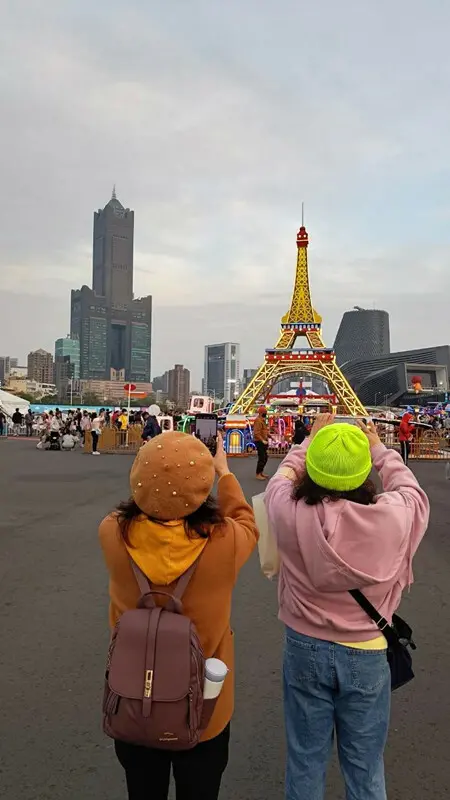 我和純娟忙著拍照,因為難得能夠讓巴黎鐵塔和85大樓同框,殊不知正巧被秋華這隻黃雀逮個正著,拍下了這個有趣的畫面