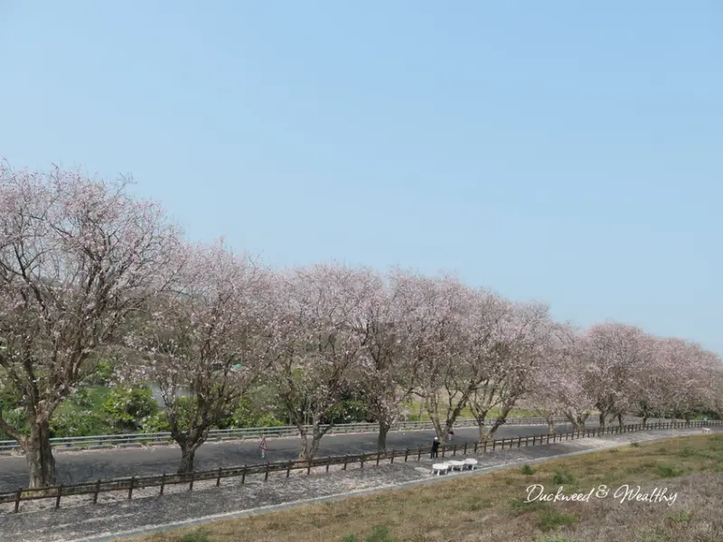 「烏山頭水庫風景區」時序已入春,烏山頭水庫香榭大道南洋櫻已開花,