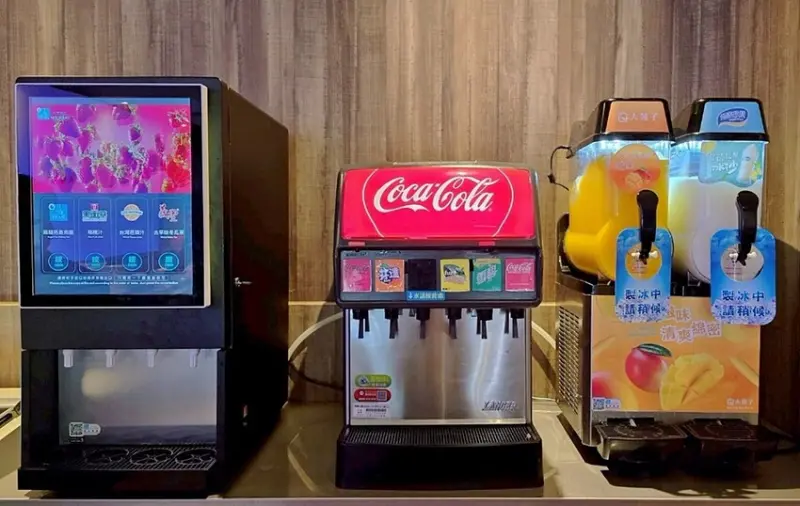 飲料機除了氣泡飲料。還有大苑子的芒果冰沙、但我比較偏愛右邊的優格冰沙。比較酷的是這裡有黑面蔡楊桃汁、義豐古早味冬瓜茶,喜歡喝無糖的也有烏龍茶唷!