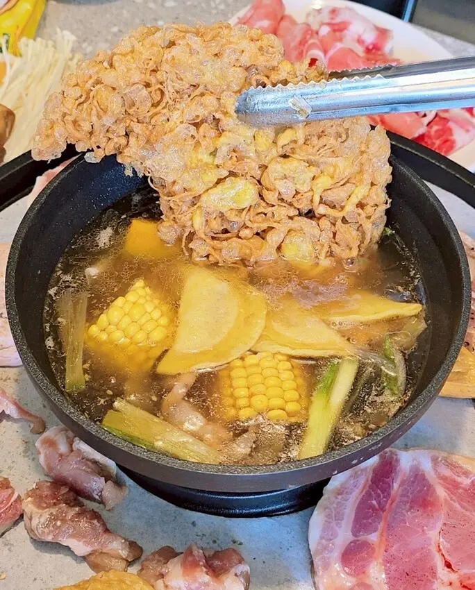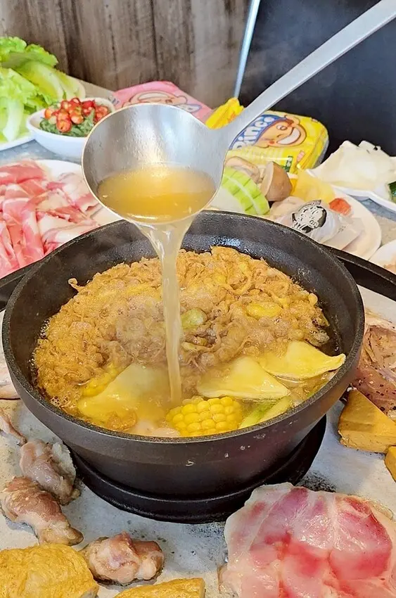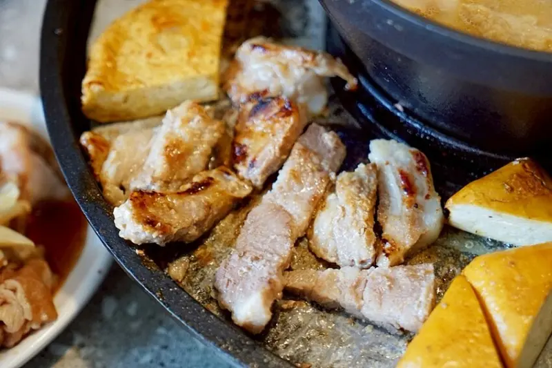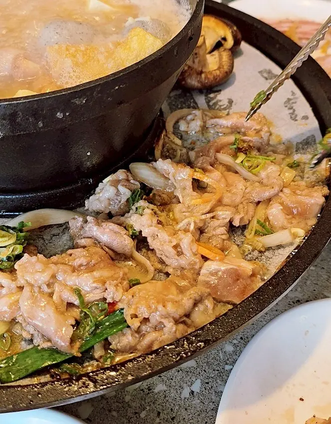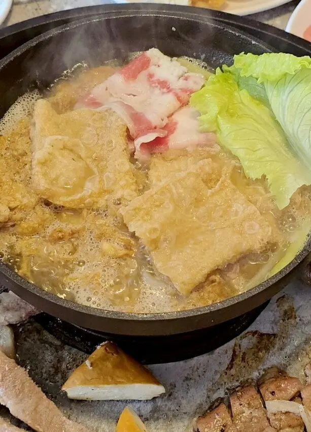 爆香過程有夠香!!服務人員先在燒熱的石鍋上淋上麻油,逼出香氣後、再放入蔥段、蒜末以及肉片下去炒香,中途會再加入特製醬汁,倒入清澈的高湯底,就等滾熟再放入自己喜歡的食材即可!!與此同時,四周圍繞一圈的烤盤上,就可以放入自己喜歡的肉品、豆干、米血等烤物,一鍋兩吃雙倍滿足,加上多重美味更是讓人肚皮幸福。