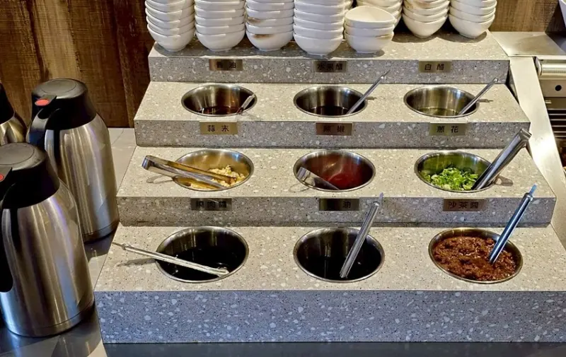 醬料區有香油、水果醋、白醋、蒜末、辣椒、蔥花、燒肉醬、醬油以及沙茶醬,就看個人的口味來調醬囉!一旁還有高湯壺,需要補充高湯就自取囉!!