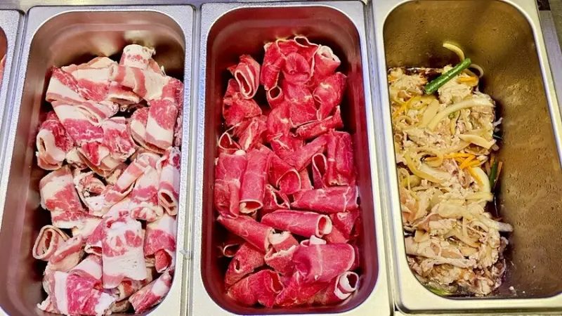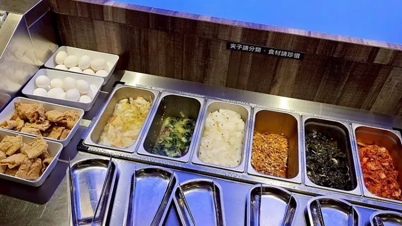 另有提供多樣小菜,韓式泡菜、醬味海帶芽、麻辣黃豆芽、酸甜白蘿蔔、辣味小黃瓜以及台式脆泡菜,就依照自己喜歡的來夾取,不用一次拿多、畢竟是吃到飽,喜歡吃完再來拿即可。一旁還有豆皮以及雞蛋。
