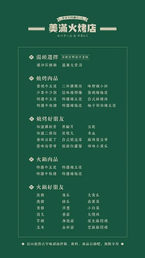 想要吃火鍋又想要吃烤肉該怎麼辦??近期在台中西屯新開了一家美滿火烤店,讓懷舊的火烤2吃經典重現囉!這時候5.6年級生就會想到過往的可利亞?那一邊烤肉一邊吃著火鍋內的美食,回憶裡的熱情食光,在美滿火烤店完全的復刻囉!!