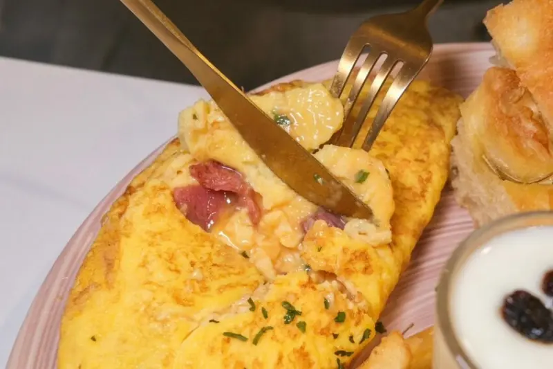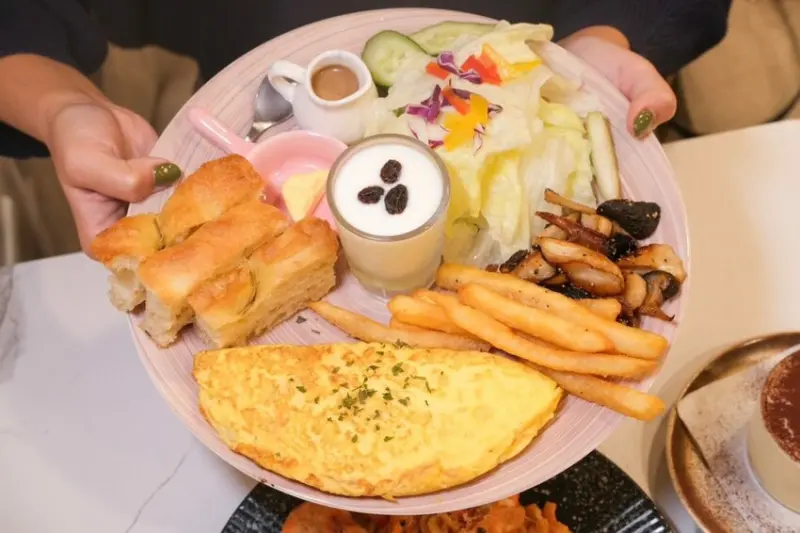 ▼CP值超高的美式歐姆蛋捲早餐盤,以誘人的培根起司蛋捲為主角,搭配沙拉、優格、佛卡夏、薯條和炒菇,培根起司蛋捲口感超滑嫩,充滿濃郁蛋香,迷人的半熟程度剛剛好,另外要大推它們的佛卡夏,咬起來超蓬鬆涮嘴,完全不會乾乾的!