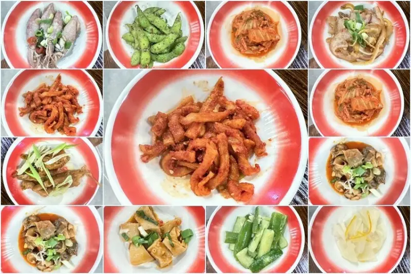 韓式辛奇、柚香大根、宜蘭鴨賞、蒜味螺肉、涼拌脆腸、涼拌小卷、