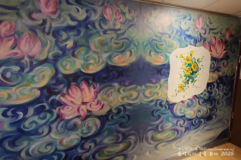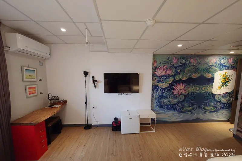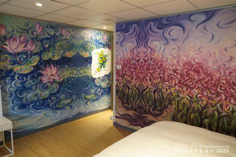 這裡的每間房間都是按畫家的要求所設計佈置,房間裡的牆壁上也會有畫家的畫作還可以感受到每位畫家想傳達的意念,我們這次入住的是有東方梵谷之稱的王以亮老師所繪製的房型,印象畫派4人房