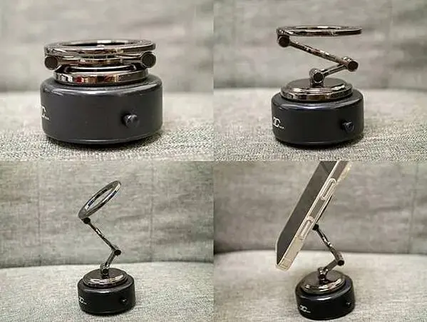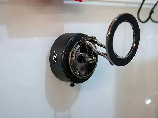 不同於一般手機支架要手動固定,這款支架內建真空吸附技術,只要輕按一下,一手操作強力吸附
