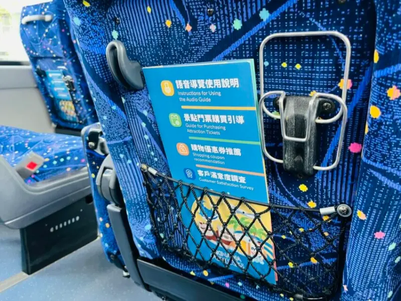 沖繩觀光巴士座位上,都配有多語系「語音導覽使用說明手冊」,拿起手機按照上面的操作流程就可以輕鬆使用語音導覽服務。