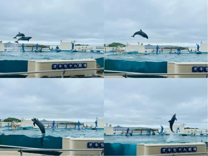 如果你也喜歡海豚秀,巴士抵達後,請你立即飛奔前往海洋博公園的海豚劇場,13:00剛好有一場海豚秀表演。海洋博公園很大,從停車場下車後快步衝過去差不多可以趕上海豚秀表演,當天很幸運還坐到視野蠻好的觀賞位置。