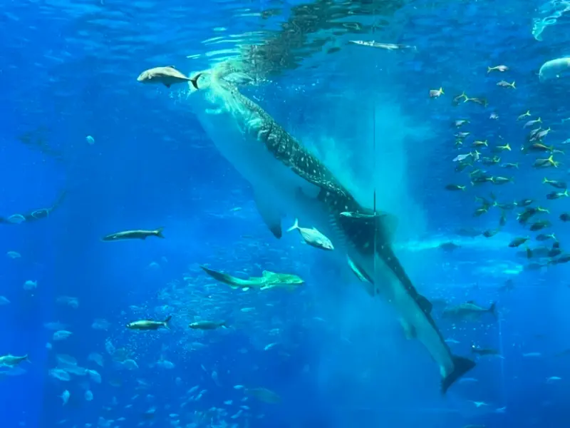 沖繩FunPASS觀光巴士北部路線還有個超棒的地方,停靠時間剛好搭配上鯨鯊餵食秀時間(15:00),讓我有機會可以美麗海水族館內親眼目睹鯨鯊餵食秀。其實光是看他水缸裡游來游去就已經很驚艷了,能親眼近距離看見餵食秀,除了驚訝也有點感動!