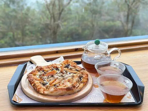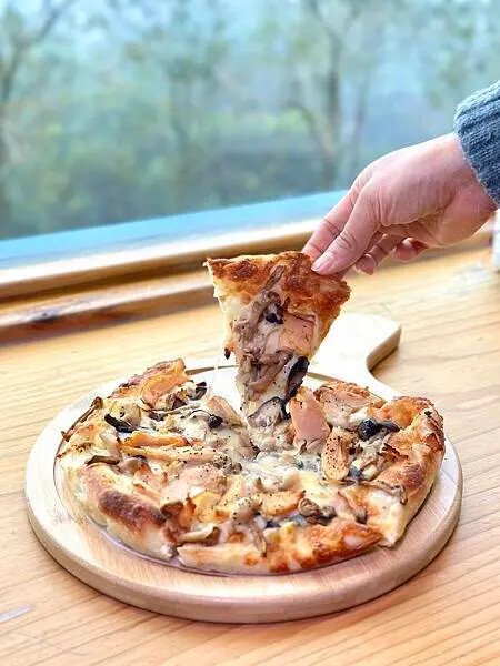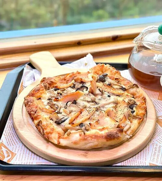 這次蛋寶點了一份pizza跟一杯茶來試試。他們的野菇燻雞Pizza是現點現烤的,上面鋪了滿滿的野菇、燻雞片跟起司。