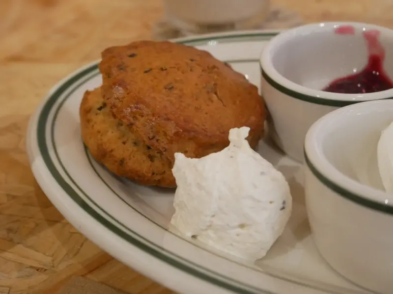 司康的酥鬆口感,在嘴裡咀嚼滿是麵粉香⋯ 果醬還有滿滿的籽