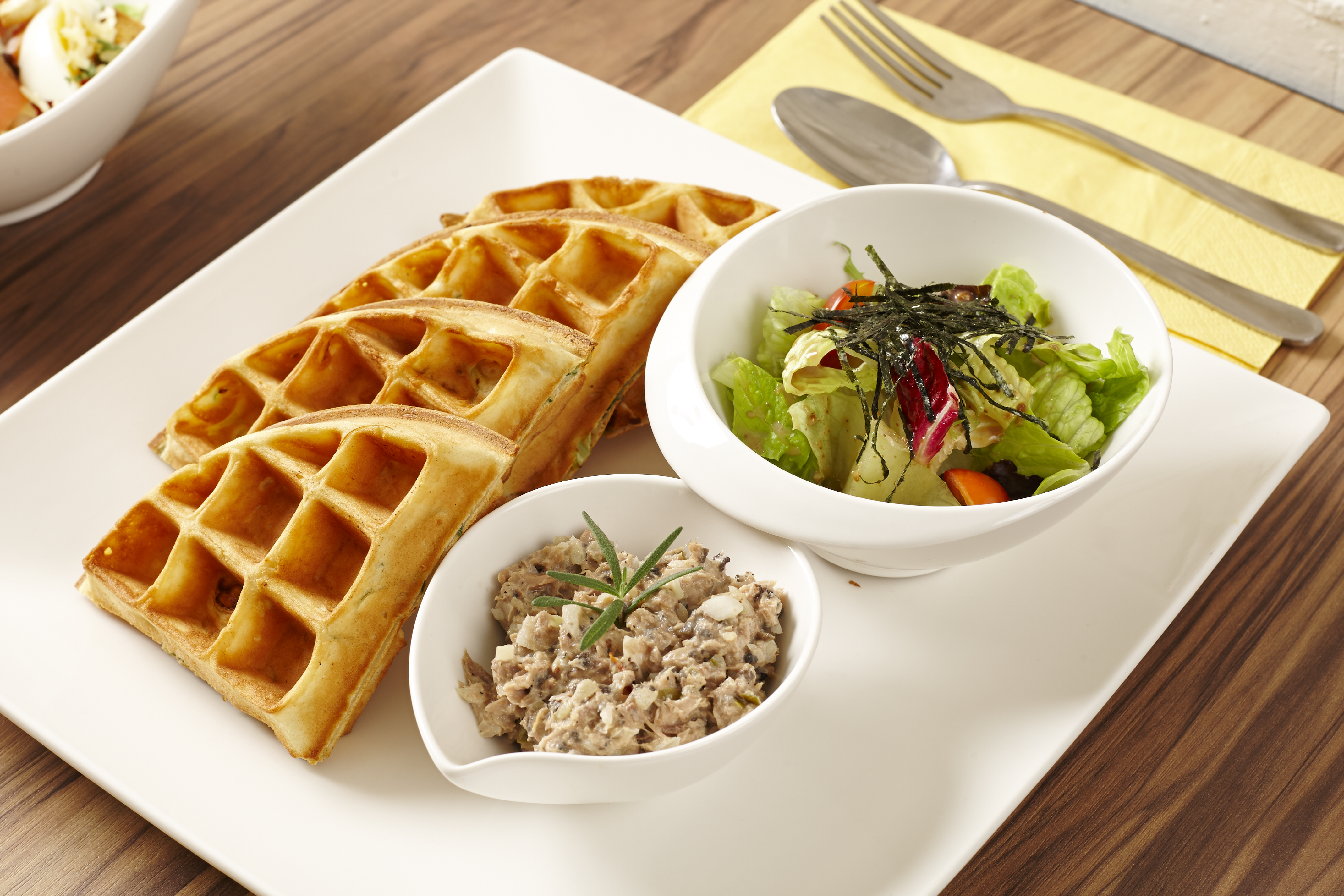 餅皮烤到黃金酥脆,相當可口,在鬆餅麵糰裡加入青蔥花,搭配店家自製的松露鮪魚醬,為輕食挹一分法式氣息,獨特的鹹口味鬆餅,展現老闆與師傅的絕頂創意。