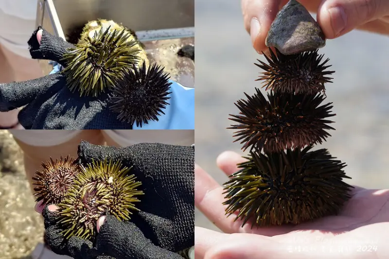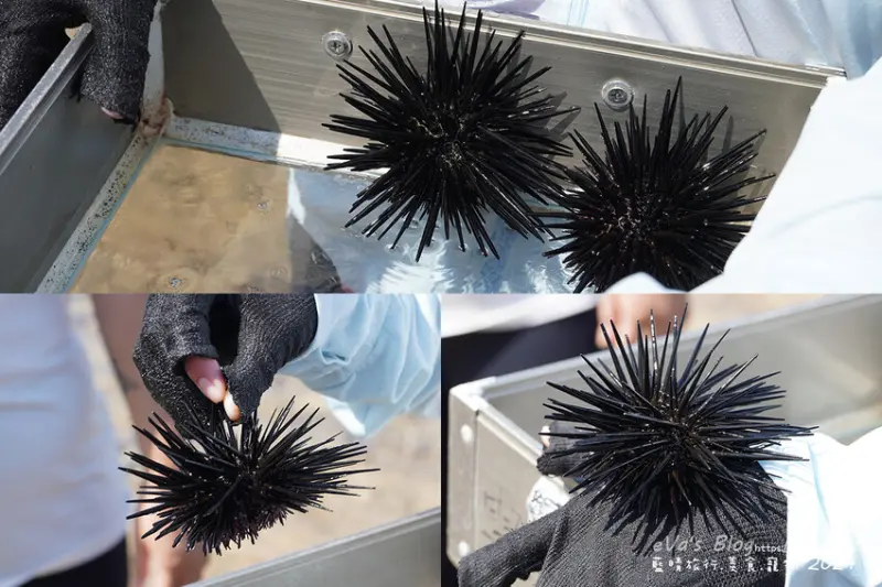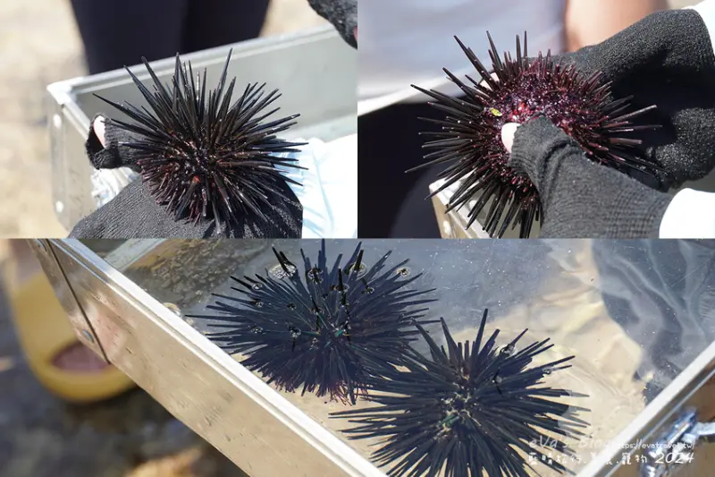 海膽上黑色的刺,浸泡海水之後會變成綠色的,好好玩呀!導覽員說,綠色就代表著是沒有毒