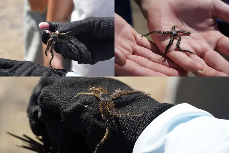 長的很像海星的陽隧足,陽隧足的再生能力很強,當遇到危險的時候就會跟壁虎一樣斷尾求生,導遊抓給我們看的這隻陽隧足五隻腳長的不太平均是因為有斷過又重新長出來,末端比較淡顏色就是新長出來的腳
