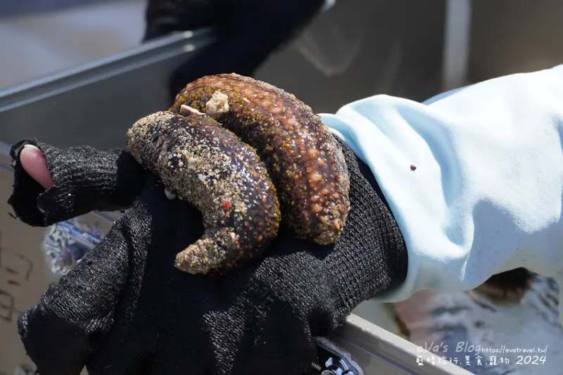 長條形的海參,海參沒有眼睛,但有嘴巴(在嘴巴周圍有一圈觸手)、肛門,知道海參吃什麼的嗎?答案…海參吃沙子,因為沙子裡面有一些有機物質,海參靠那些在分解營養,海參是夜行性生物,白天狀態就是打開嘴巴伸出觸手捕捉食物沒有毒性