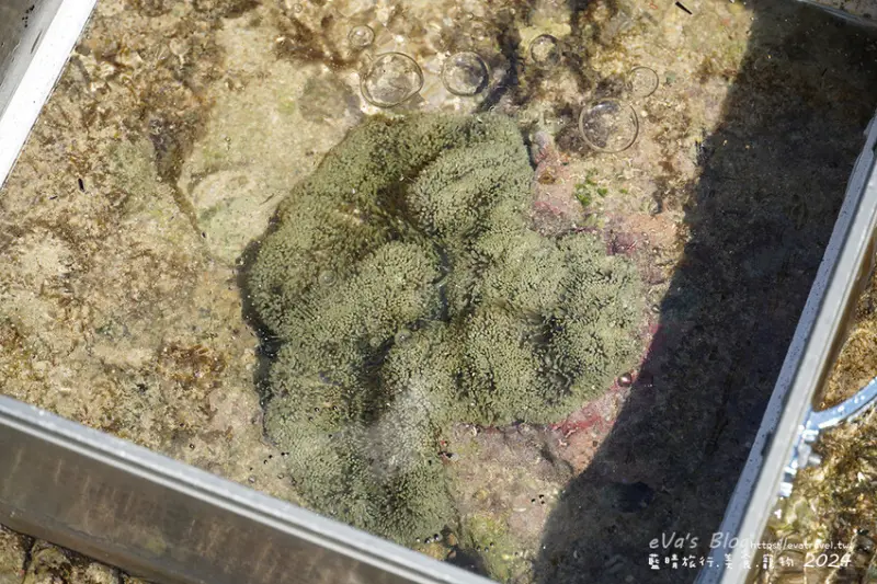 水底下有一團綠色毛毛的,導覽員將她手上的透明盒子(可以把水面的波紋蓋住)放入水裡,讓我們可以更清楚的看到海葵耶!一般的透明盒子也可以這樣使用但是看到的畫質有差,沒有導覽員手上的透明盒子來的清晰